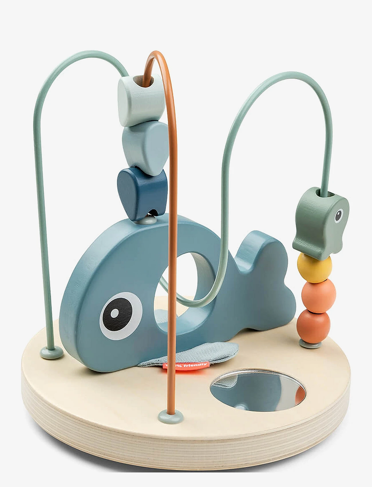 With the wooden Wally bead maze your child can practice fine motor skills and pincer grip while moving the small beads and fish from one end to the other. The whale and the sea elements inspire your child to be curious about life underwater. Little fingers can move the fish up and down to explore the moving fish in the small mirror – and let it swim through Wally’s belly. The whale’s fins are made of soft and crackling fabric, and the sturdy base is designed to stay stable on the floor. The Wally bead maze is designed in ocean blue tones with colourful elements. The wooden toy is made from responsibly sourced wood and painted with water based-paints that are free from harmful subtances – making it safe for your child to use.