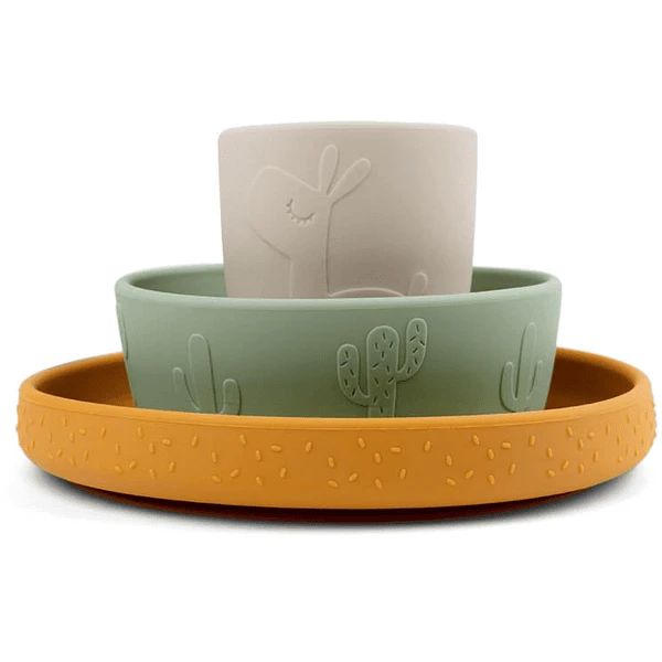 Auf dem senfgelben Teller, der grünen Schüssel und dem sandbeigen Minibecher sind