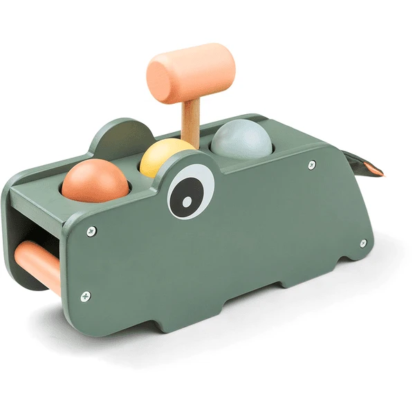 zum Tragen und vorne, um die Kugeln beim Rausfallen zu beobachten - Die Krokodil-Klopfbank ist grün mit bunten Elementen