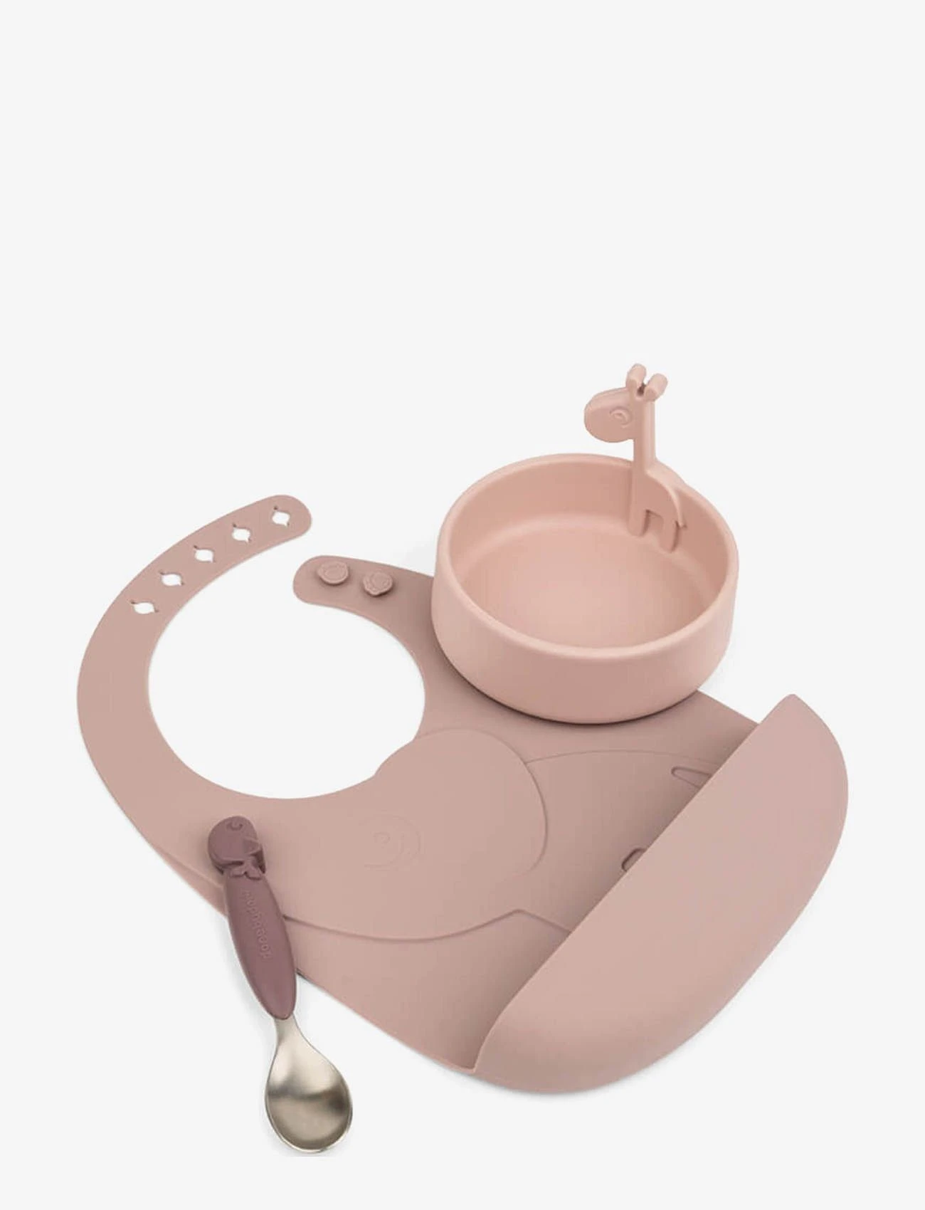 The Peekaboo first meal set is designed to trigger the curiosity of little eaters. Elphee, Raffi and Wally peek out from the dinnerware – making mealtime an extra fun time of the day. A perfectly sized dinner set for learning to self-feed. The cute bowl, spoon and practical pocket bib are made of food grade silicone. It makes the Peekaboo dinnerware shatterproof as well as adding anti-slip/easy-grip features and making the Peekaboo bowl suitable for use in microwave. Little ones will enjoy having the fun animals join them for mealtime – let Elphee’s pocket catch any food that misses and have Raffi encourage them to reach the exciting milestone of eating on their own. The cute gift set is in soft tones of powder.