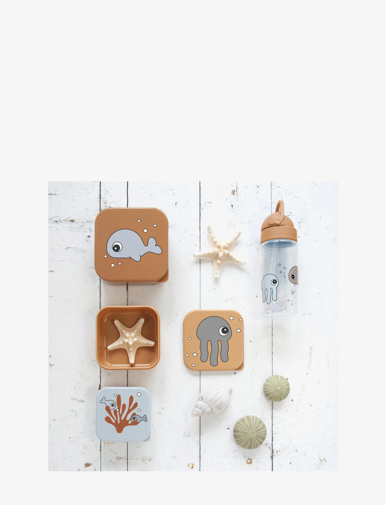 Remember to fuel up on-the-go. Pack your favourite snacks in this practical snack box set with three different sized boxes. Ideal for separating snacks, lunch or even crayons and other little things you want to pack and bring with you when you go places. A perfect food box set for packing food for pre-school, school and outings – Jelly the jellyfish and Wally the whale will love to come along for exciting adventures. The cute Sea friends snack boxes in different tones of mustard and grey have cute ocean themed illustrations.